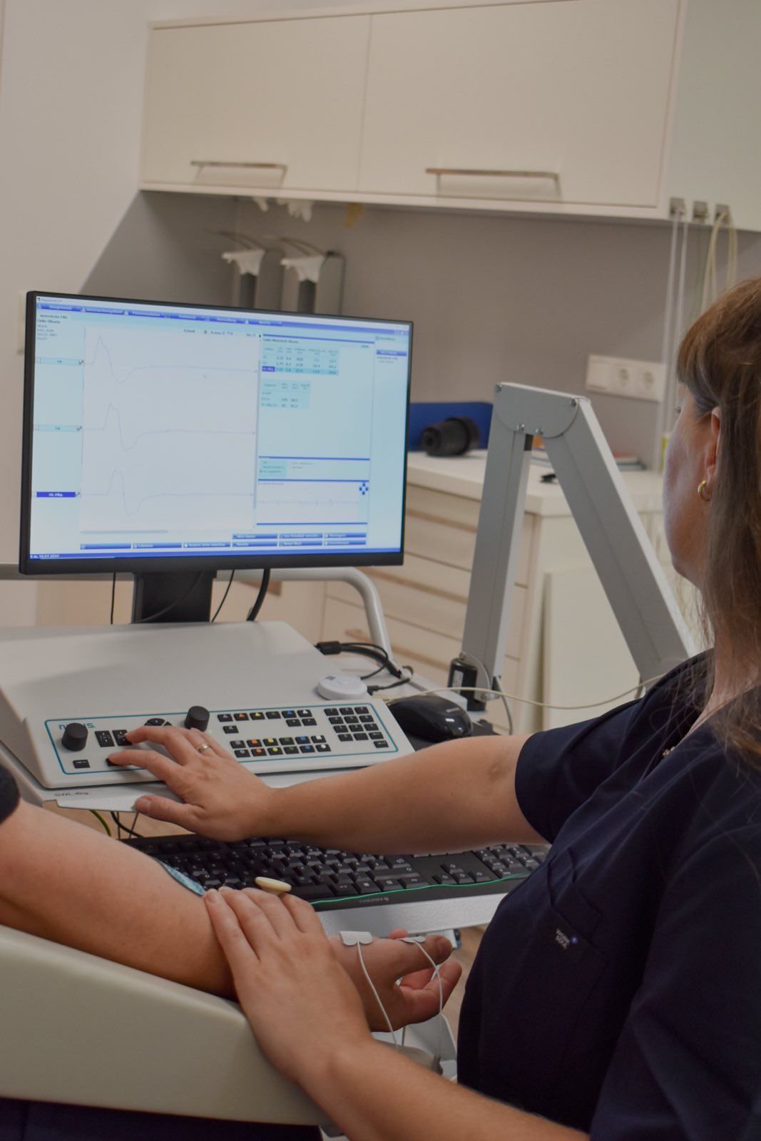 Mit dieser Methode wird die Leitfähigkeit der Nerven an Armen und Beinen mittels Bestimmung der Nervenleitgeschwindigkeit untersucht.
